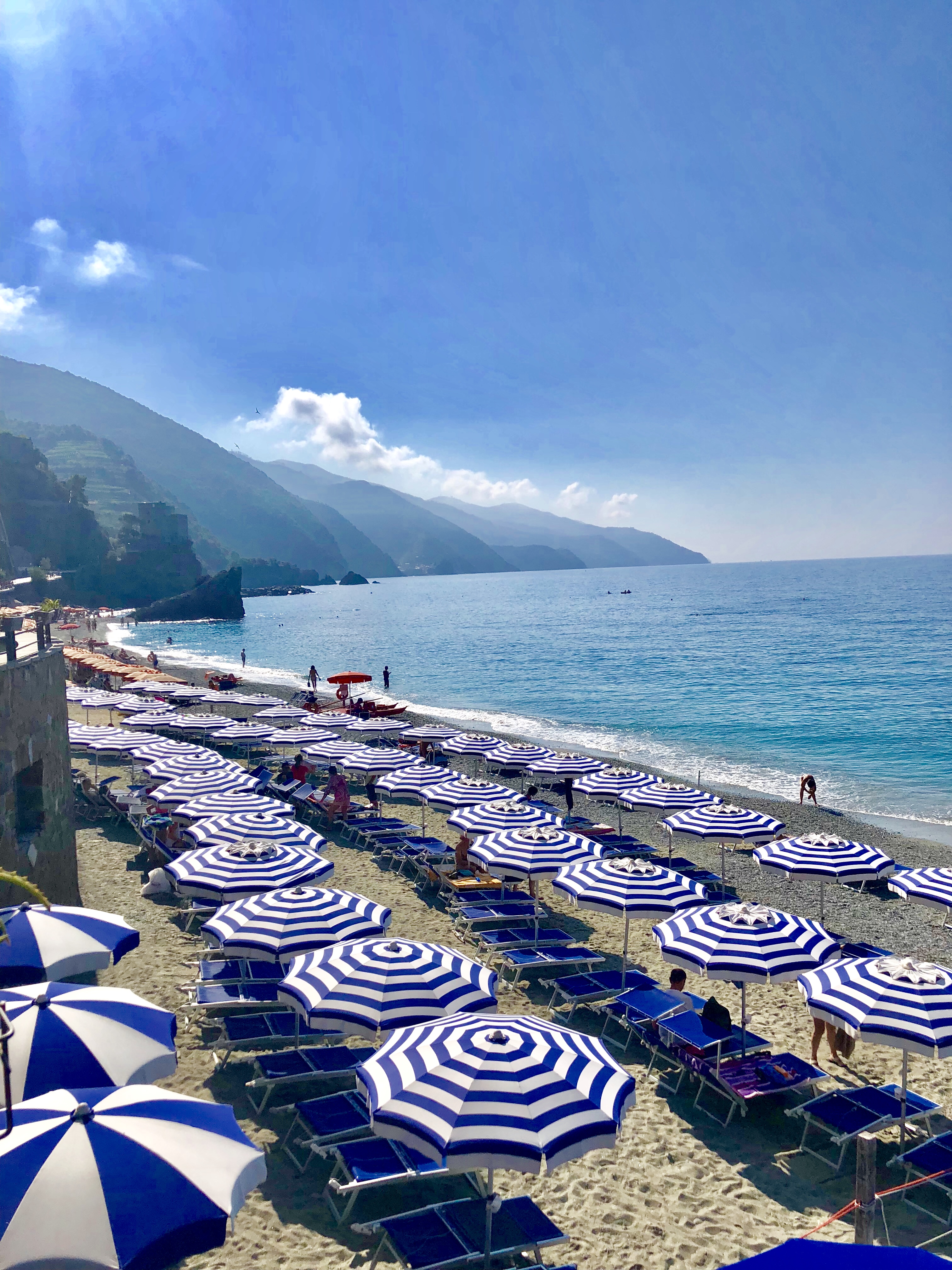 My sister and I decided to take a 3 hour train ride from Milan on Italia Rail to Monterosso. Monterosso is one of the town that makes up Cinque Terre. We spent the day at the beach there that was absolutely stunning. If you can reserve lounge chairs ahead of time because by the time we got there (at 9:30 am) most of the lounges were already reserved.